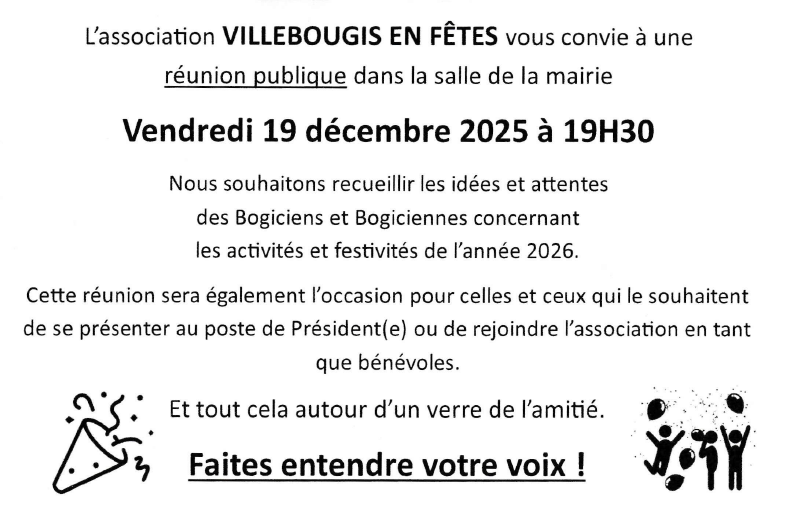Réunion de l'association VILLEBOUGIS EN FETE Vendredi 19 décembre 2025 à 19h30 à la mairie de villebougis.