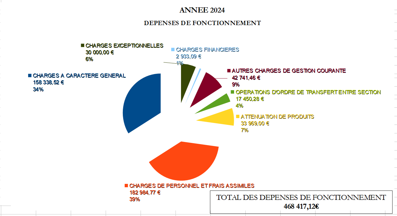 Les dépenses de fonctionnement sont représentées par les frais à caractère général (entretien des bâtiments, des matériels, de la voirie, achats des fournitures, participation scolaire dans les autres communes....), les frais du personnel, les frais du SIVOM, les subventions aux différentes associations, la charge financière (intérêts des emprunts).