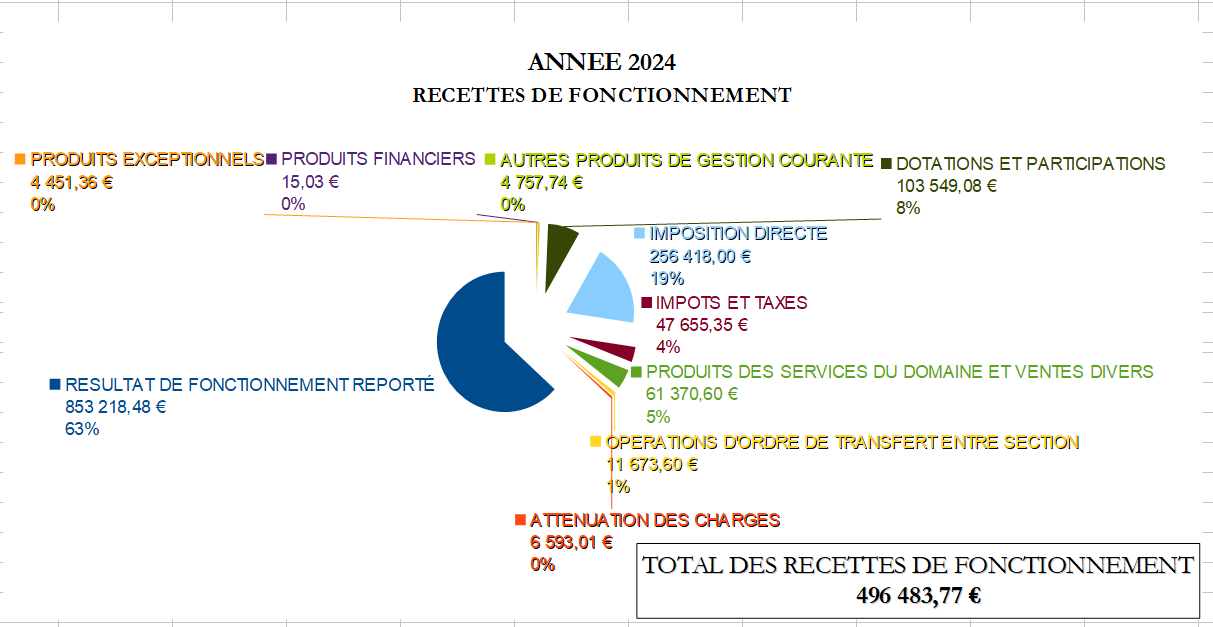 Les recettes de fonctionnement sont représentées par excédent antérieur reporté, produits du service du domaine (concession cimetière, produits de la zone d'activité de la Com-Com et autres redevances), impôts et taxes (produit des 4 taxes communales) dotations, subventions et participations (dotations de l'état)et autres produits de gestion courante (loyers des terres et bâtiments communaux).