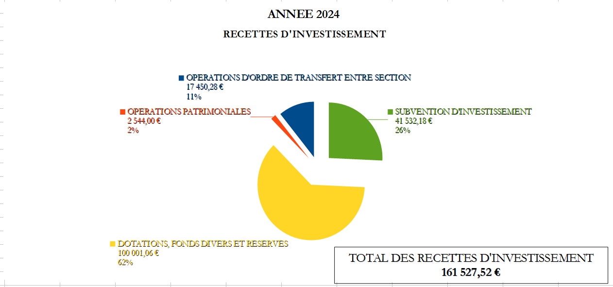 Les recettes d'investissement sont représentées par les opérations financières (virement du chapitre fonctionnement), les subventions et les opérations non individualisées.