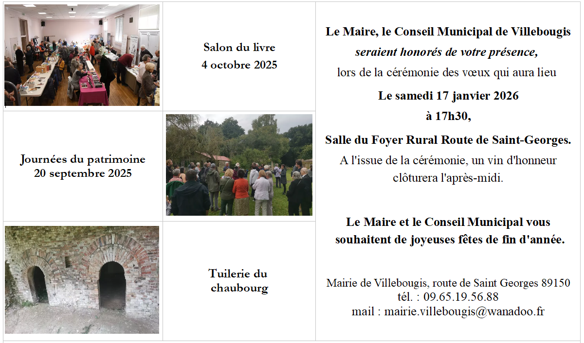 Monsieur le Maire de la commune de Villebougis, M. MILACHON, Marcel a convié les bogiciennes et les bogiciens à la cérémonie des vœux le samedi 18 janvier 2025 à 17h00, à la salle du foyer rural.