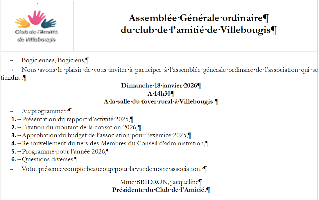 Le Club de l'amitié de Villebougis a tenu, dimanche 18 Janvier 2026 à 14h30, son assemblée générale ordinaire, en présence de M. MILACHON, Marcel, Maire de la Commune.